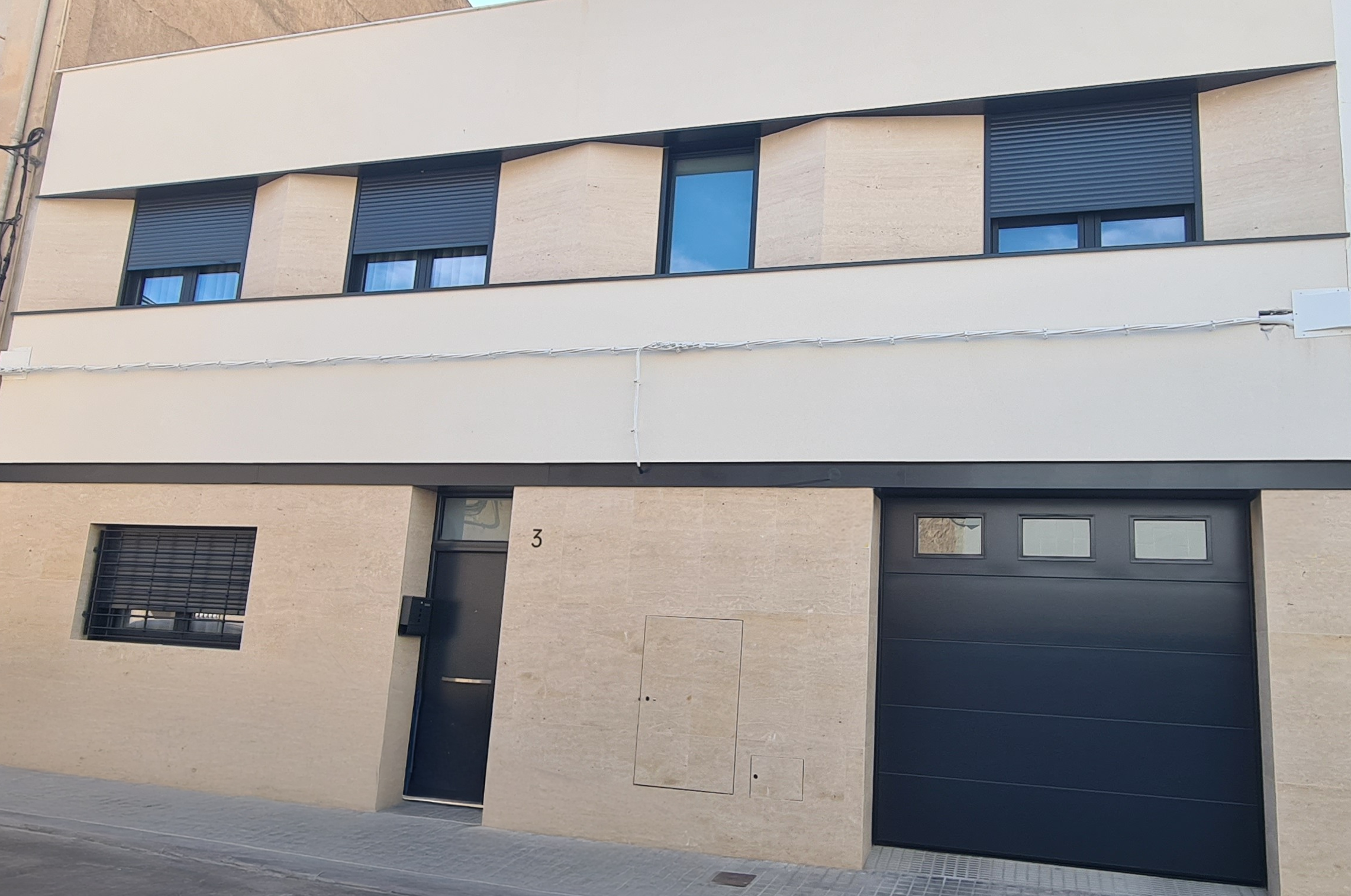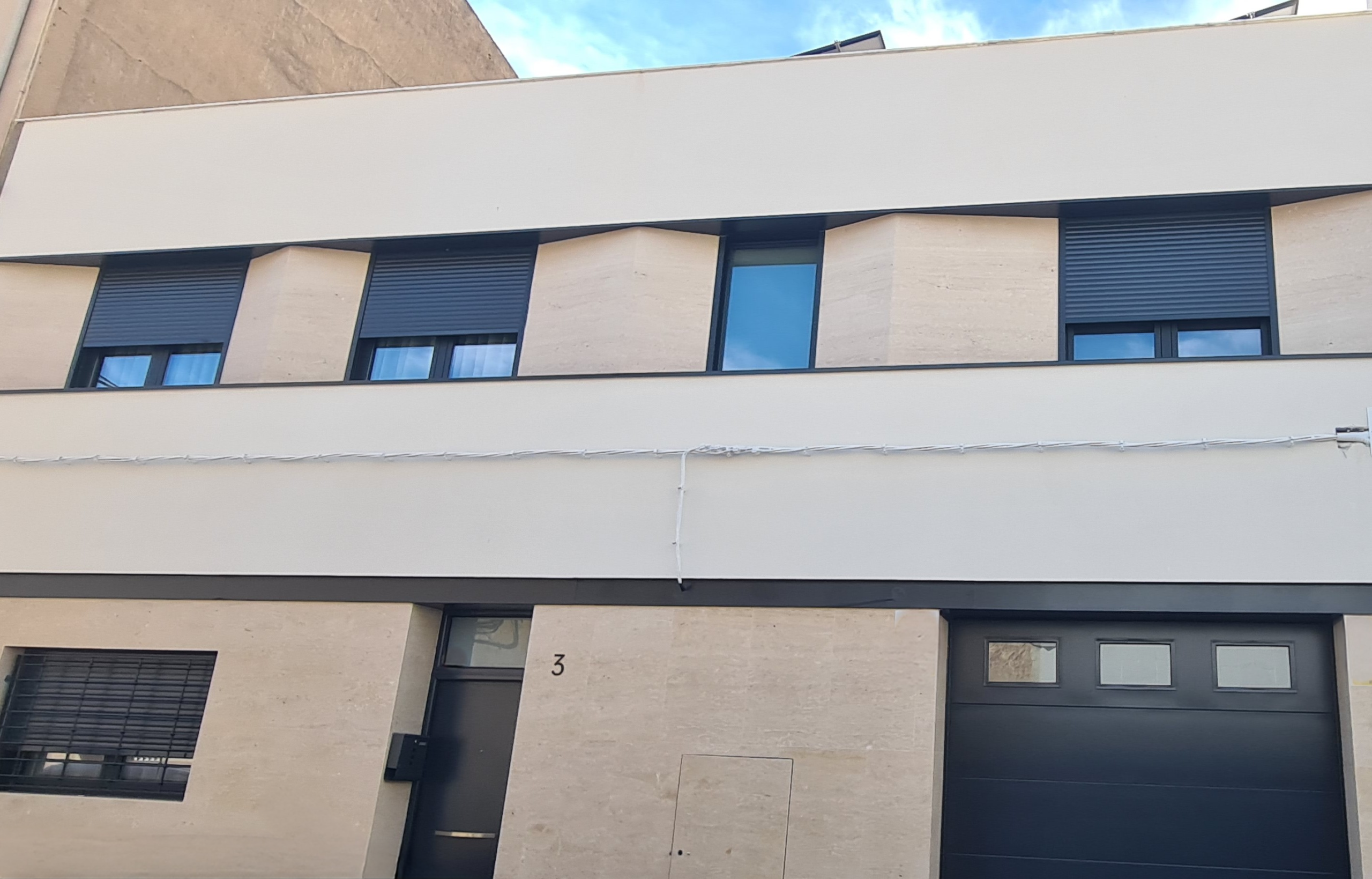 Revestimiento integral de fachada mediante placas de Travertino cortado a favor de veta. El trabajo técnico destaca por la alineación milimétrica de las juntas y el acabado apomazado, que dota a la envolvente de una textura natural y una resistencia estructural óptima frente a la salinidad del entorno marino.