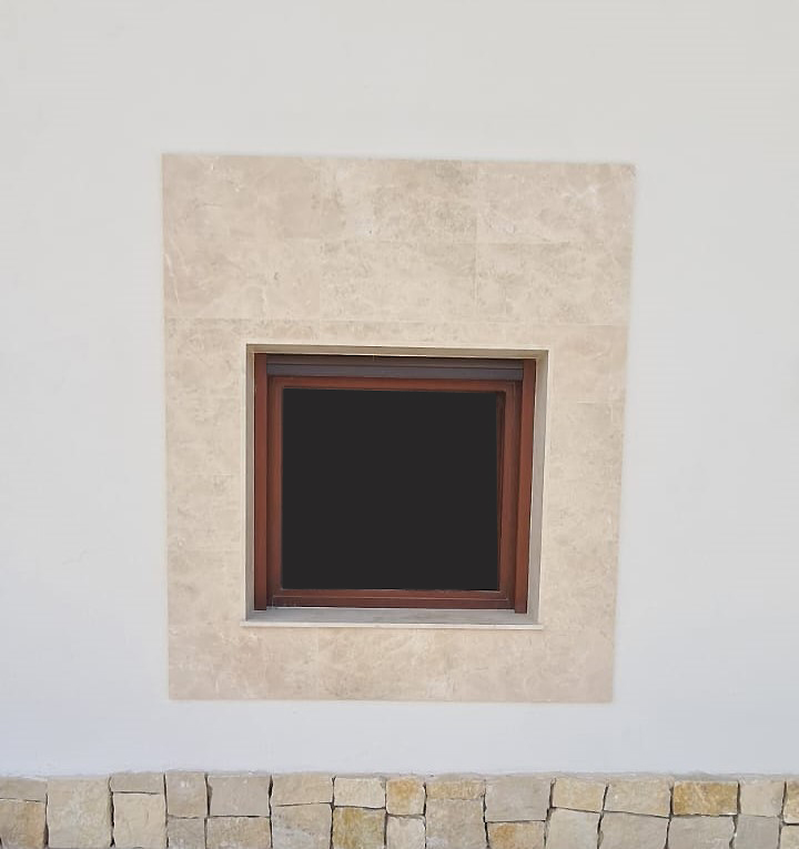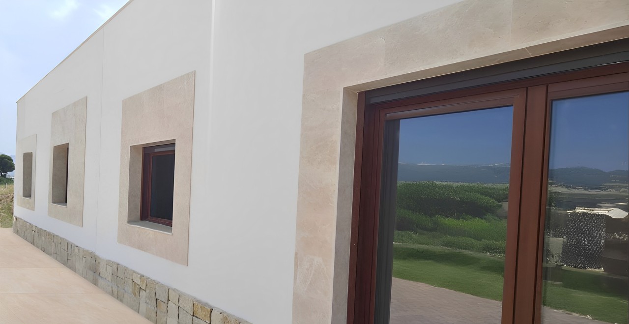 Revestimiento exterior e interior en Crema Marfil para una exclusiva propiedad de montaña. La piedra natural aporta una calidez cromática esencial que contrasta con el entorno gélido, ofreciendo un acabado de alta gama que refuerza la robustez y el diseño sofisticado de la vivienda frente al paisaje de Aspen.