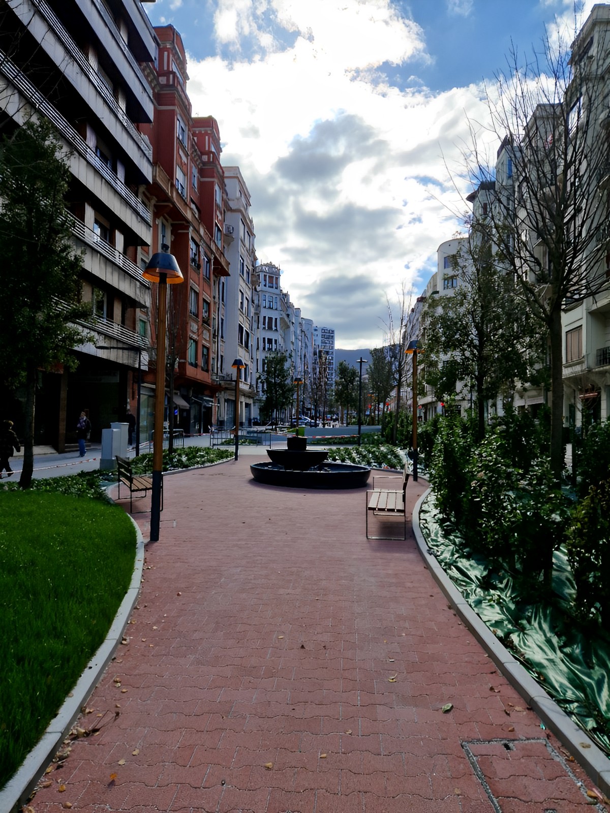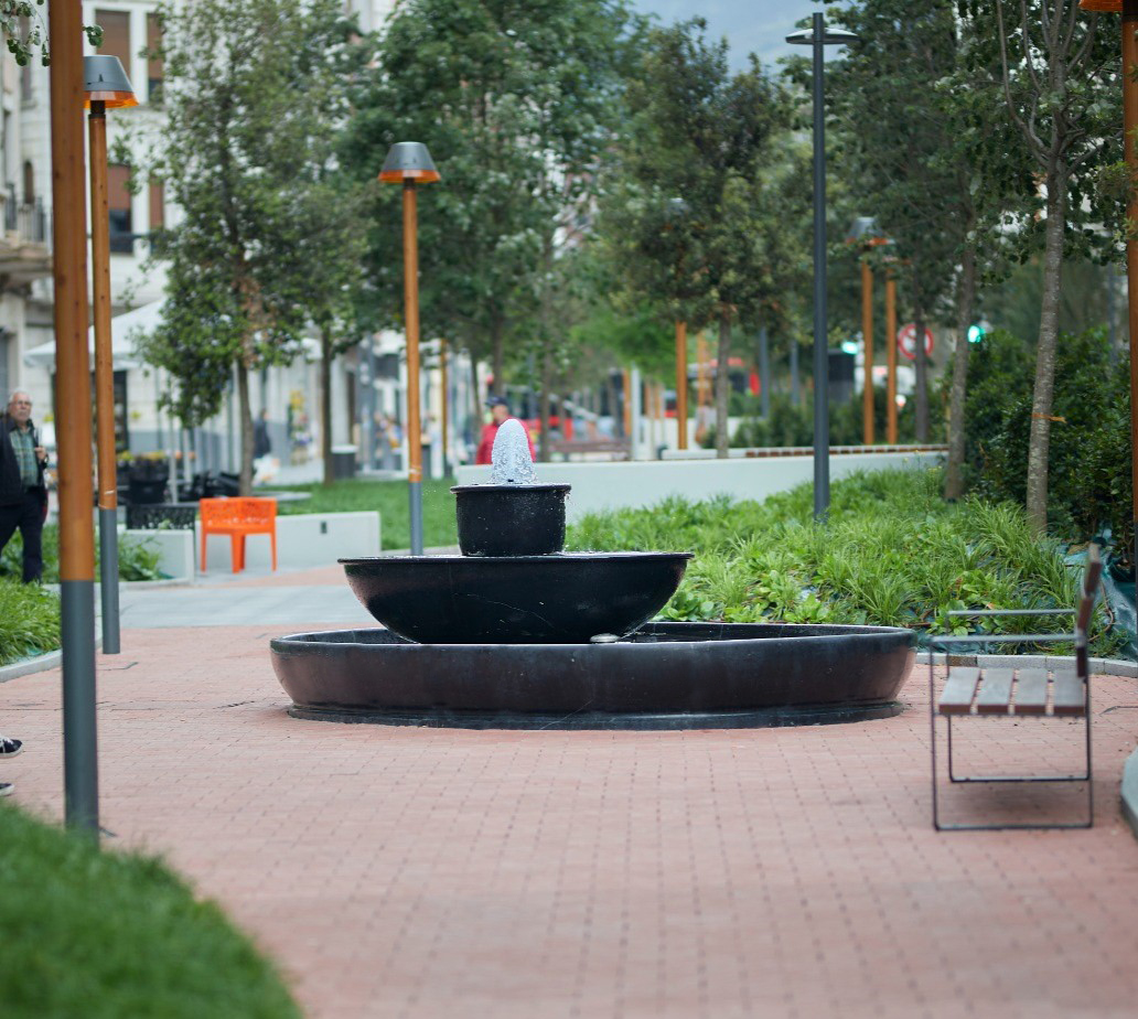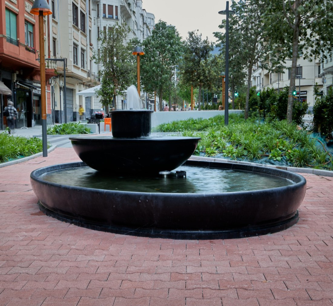 Fuente ornamental trabajada íntegramente en mármol Negro Marquina. La pieza destaca por su veteado blanco sobre fondo oscuro, aportando una estética sofisticada y alta resistencia estructural en el entorno urbano de Bilbao, elevando el paisaje mediante la nobleza del material.