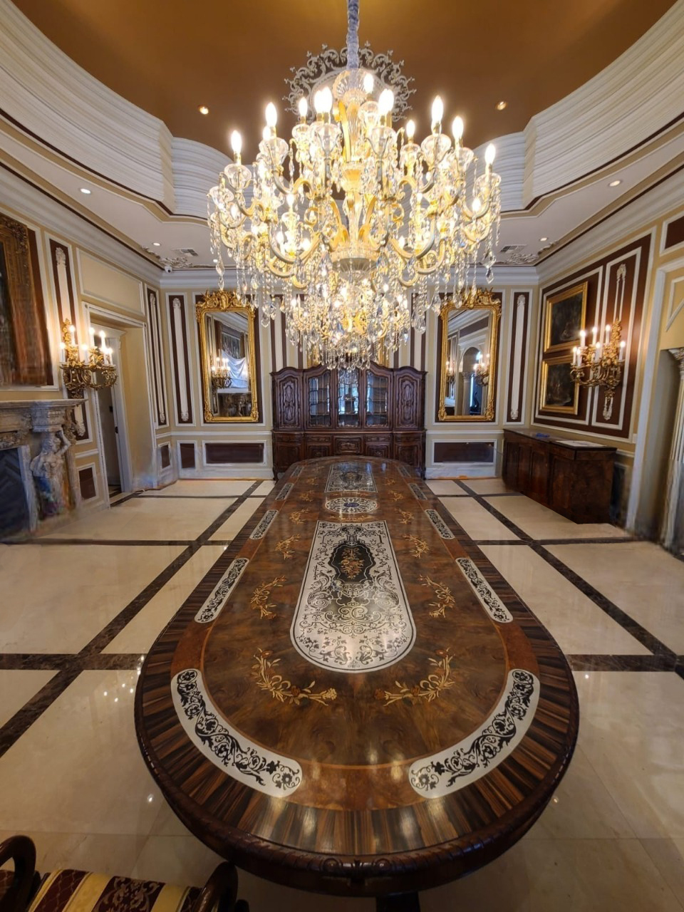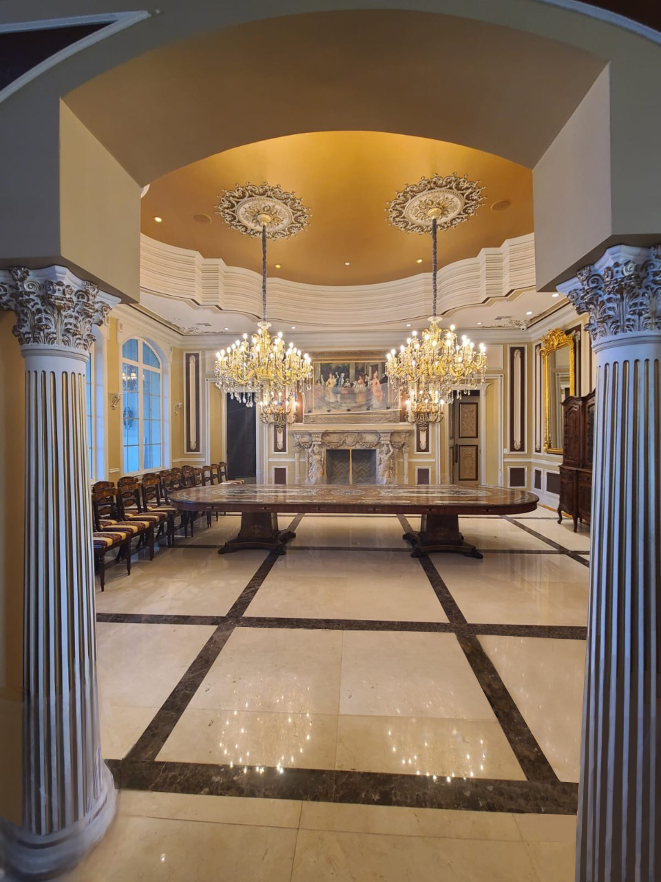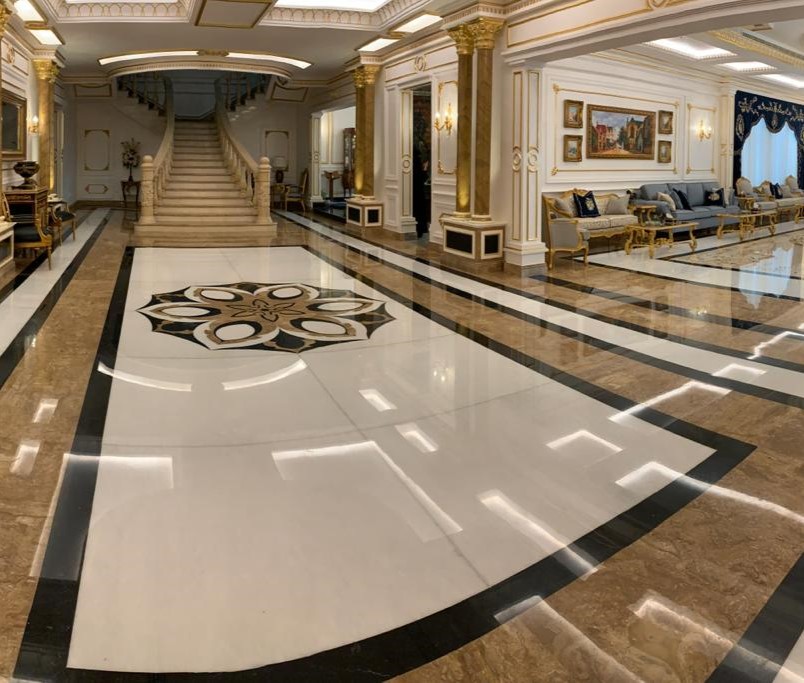 Proyecto de revestimiento de lujo en Texas con mármol Crema Marfil y Dark Emperador. Diseño y suministro de pavimentos con cenefas personalizadas, columnas macizas y una escalera imperial con trabajos de cantería a medida.