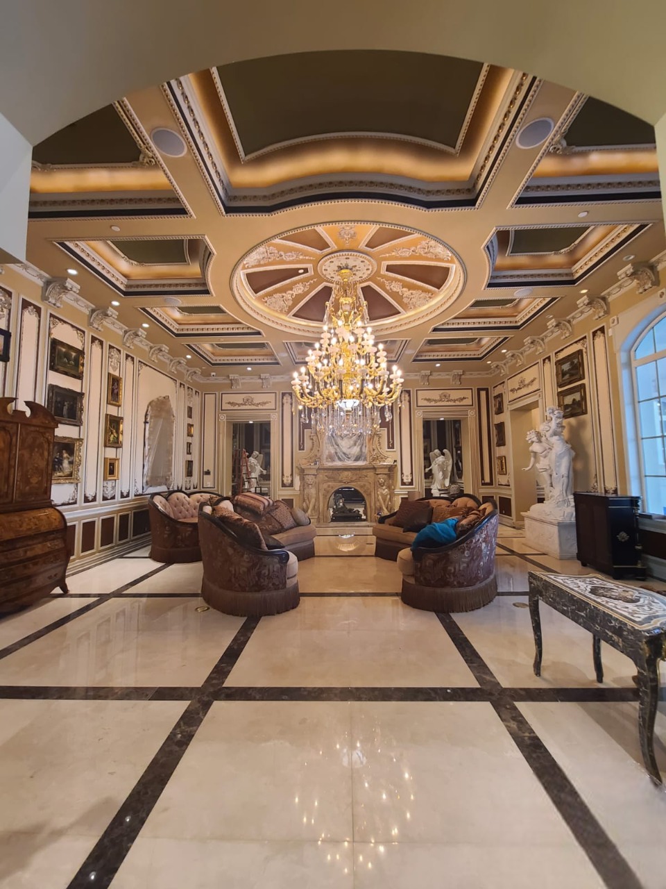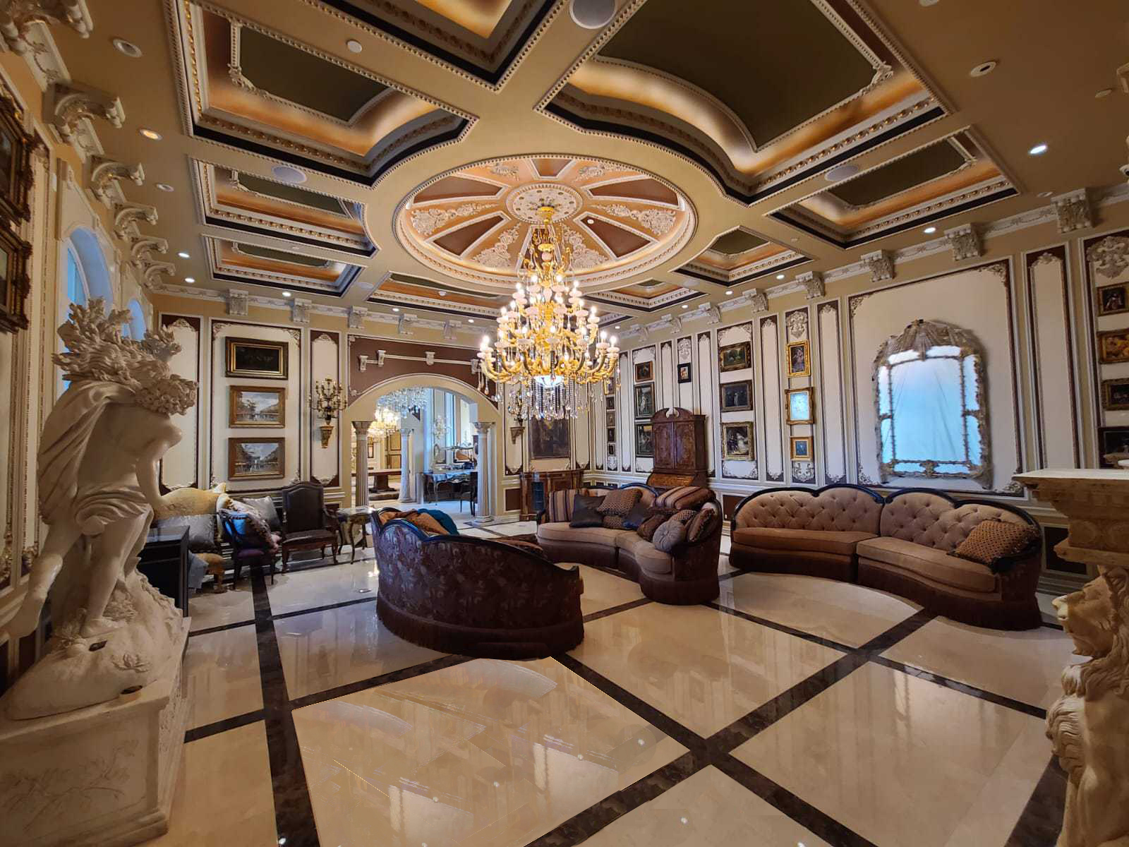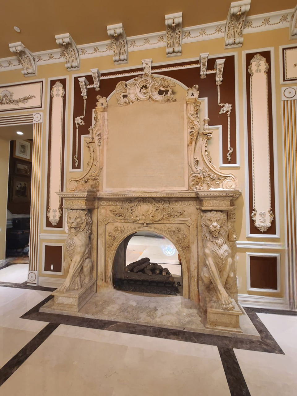 Proyecto de revestimiento de lujo en Texas con mármol Crema Marfil y Dark Emperador. Diseño y suministro de pavimentos con cenefas personalizadas, columnas macizas y una escalera imperial con trabajos de cantería a medida.