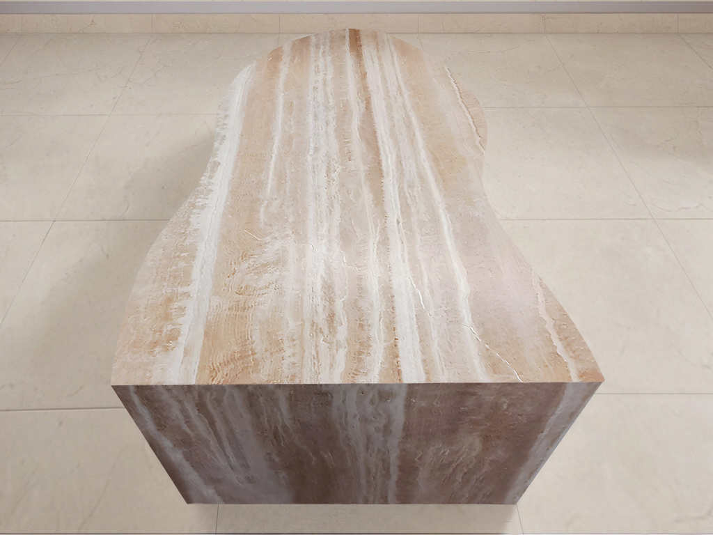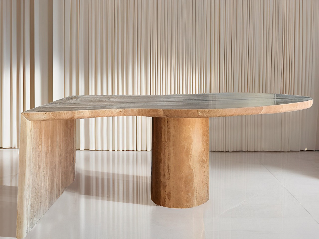 Esta preciosaMesa con cascada lateral y pata cilíndrica, está elaborada con el elegante Travertino. Su diseño sofisticado y versátil se adapta perfectamente a ambientes tanto modernos como clásicos, aportando un toque de distinción y lujo.