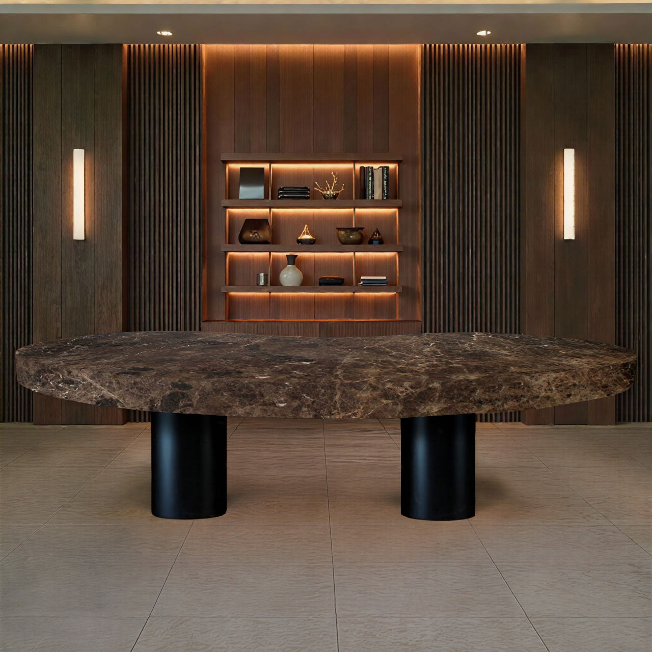 Tablero de mesa macizo fabricado en Mármol Dark Emperador de alta calidad. El diseño incluye un rebaje interior para aligerar peso y un agujero pasacables de 6,5 cm ya cortado, además de otro precortado.