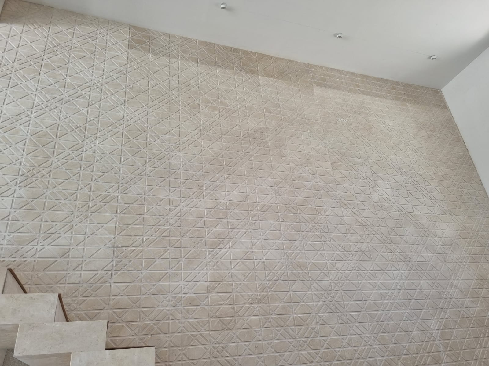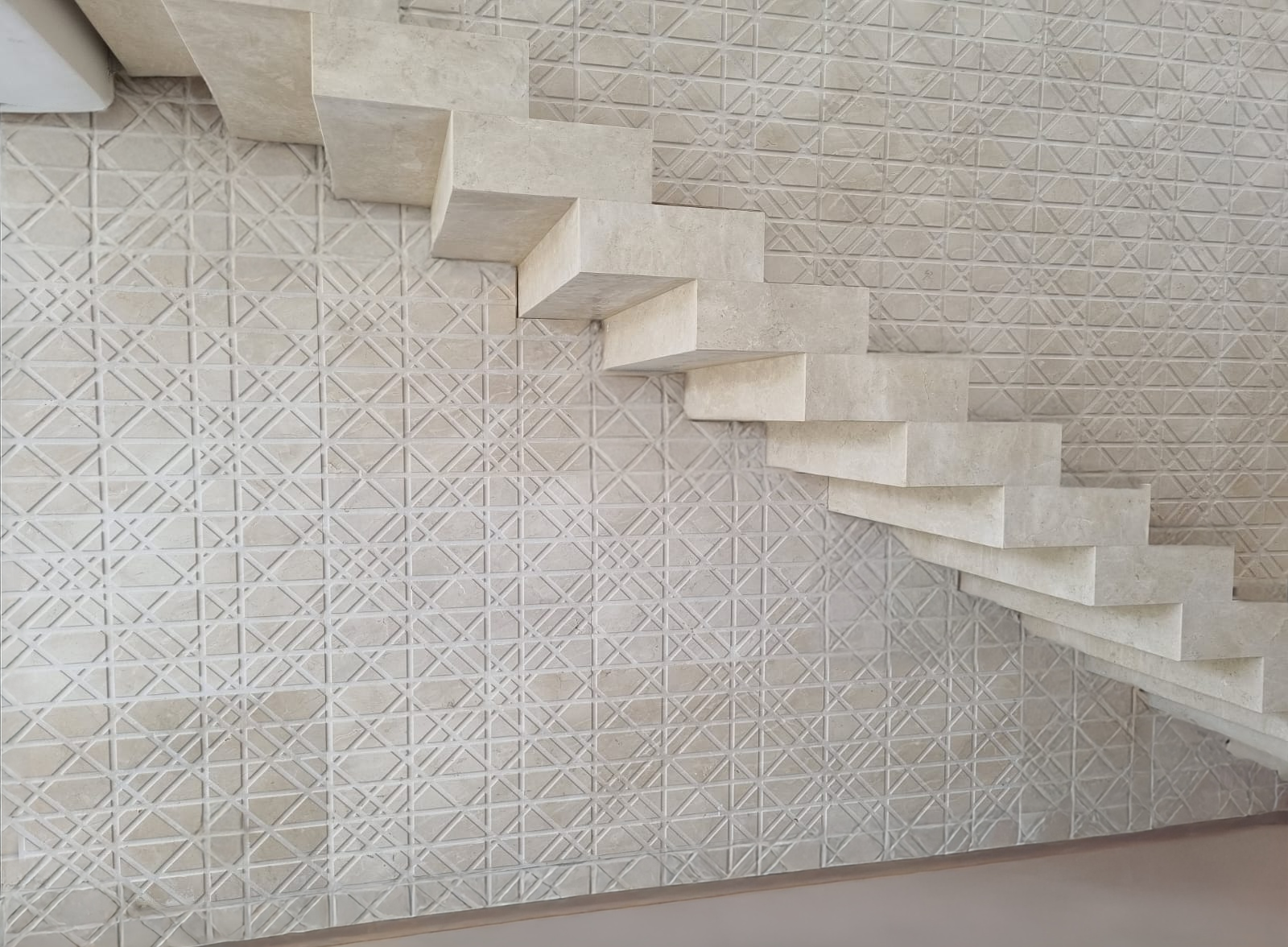 Proyecto de revestimiento premium en Benidorm ejecutado en piedra caliza con un acabado mecanizado de alta precisión. El diseño destaca por un patrón geométrico tallado que recorre paredes y el lateral de la escalera, creando un juego de texturas que eleva el material natural a una pieza de arte arquitectónico.