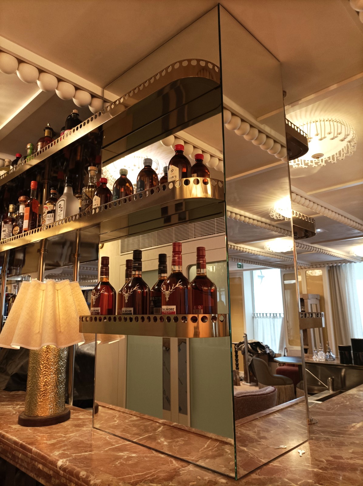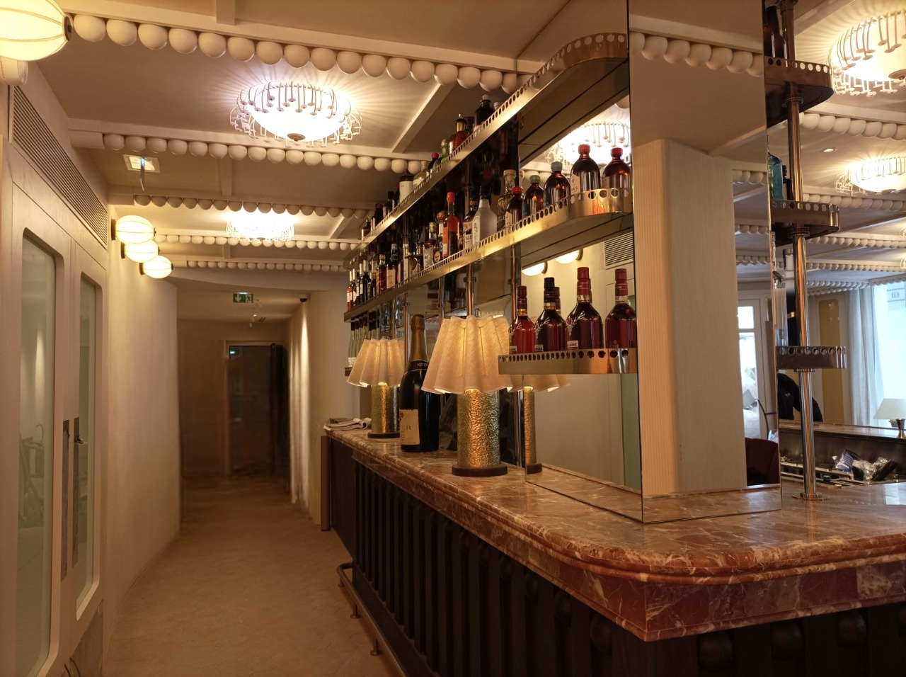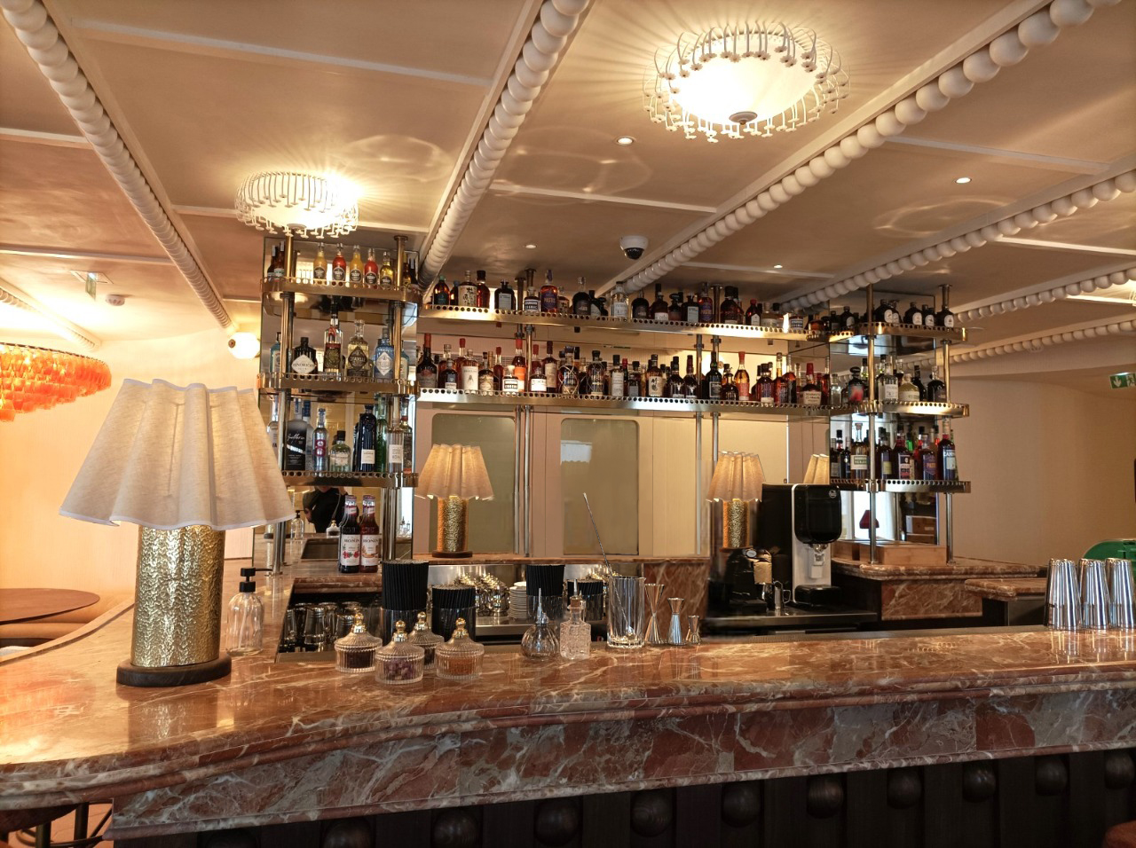 Proyecto de interiorismo de alto nivel en París con mármol Rojo Alicante. El diseño integra barras y superficies con un veteado blanco característico sobre fondo rojizo, aportando una calidez sofisticada y un contraste vibrante que define la elegancia del espacio gastronómico.